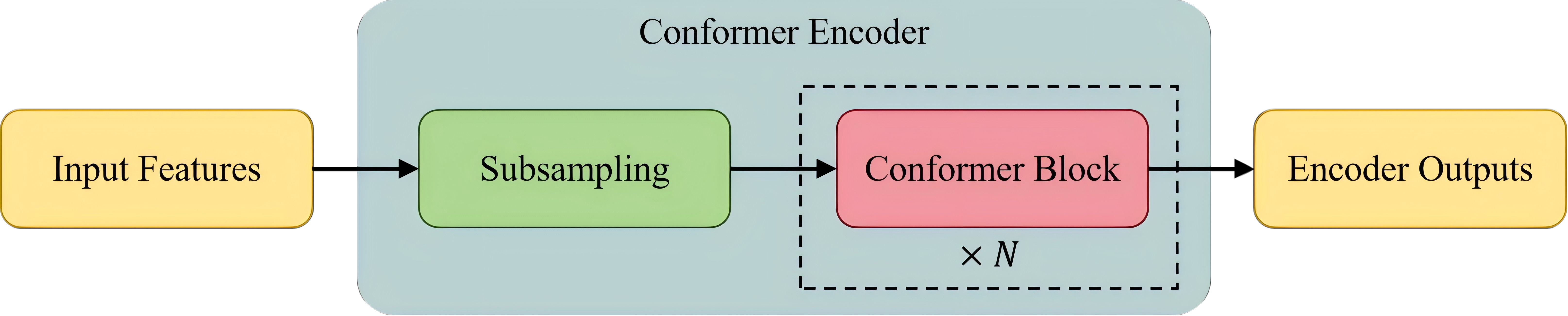 下采样模块处理后的特征随后送入一组 Conformer Block 进行处理,每个 Conformer Block 包含四个主要组件:位于块首尾的两个 Conformer Macaron-style Feed-Forward Network 模块、一个 multi-head self-attention module incorporating relative positional encoding 和 一个 convolution module equipped with gated linear unit (GLU) and layer normalization。最后经过一个LayerNorm(层正则化)输出