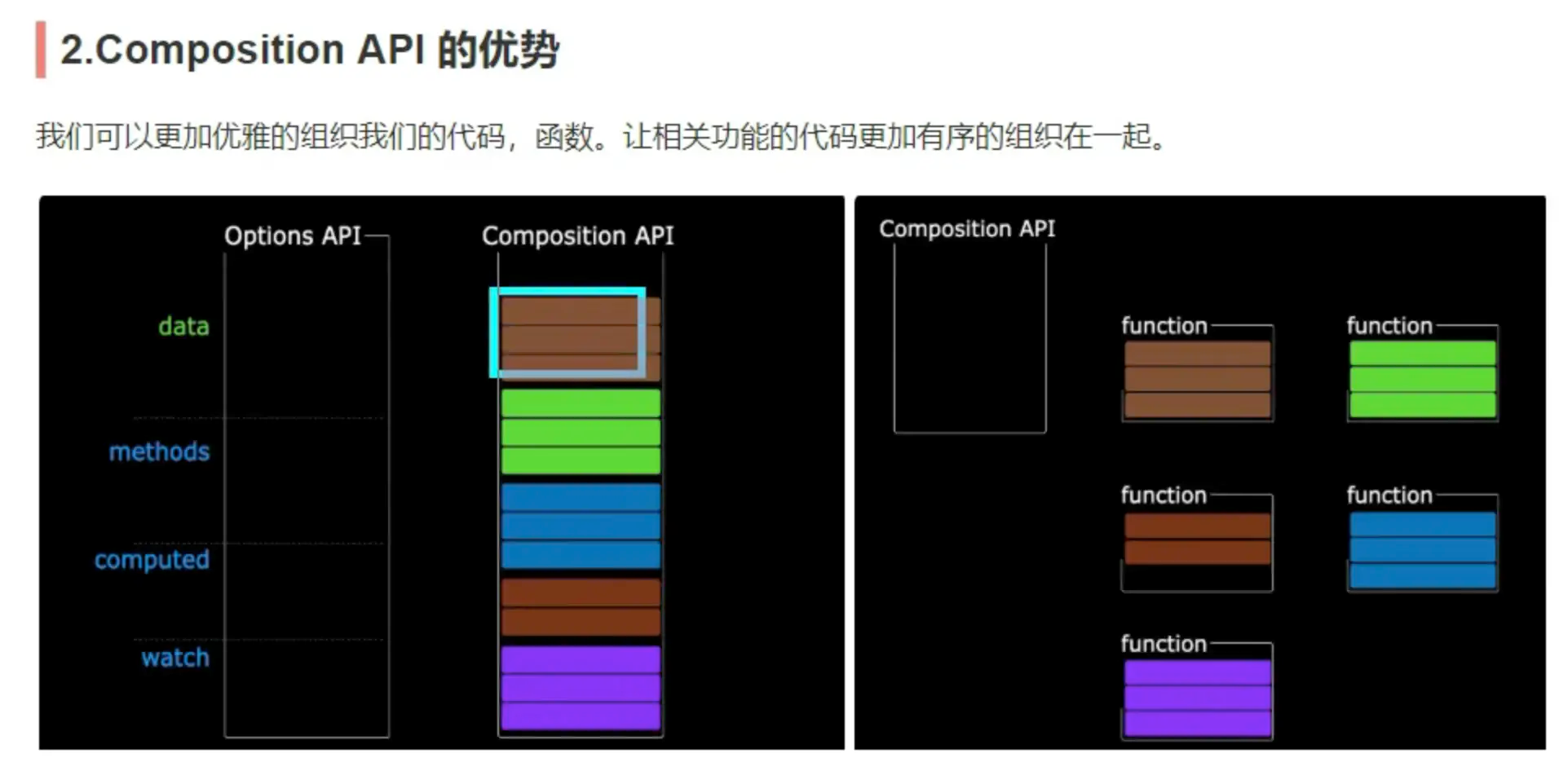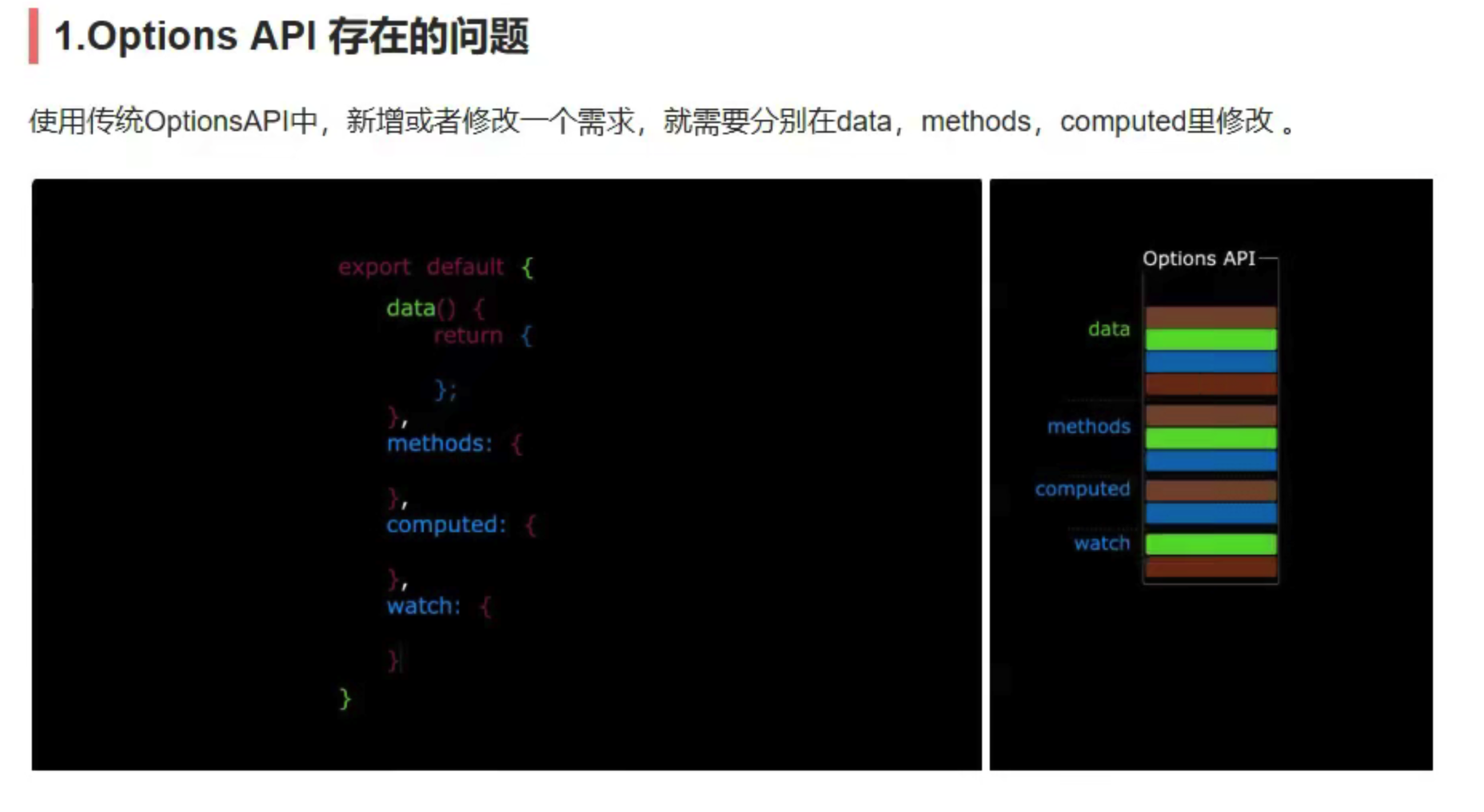 使用传统Options API中,新增或者修改一个需求,就需要分别在data,methods,computed,watch里修改