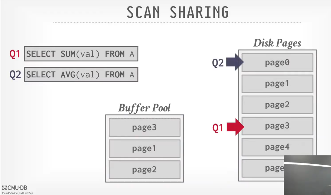 第三种优化策略是扫描共享(Scan Sharing) 。我们设想两个查询同时执行全表扫描:Q1 从 page0 开始,而Q2 稍后也从 page0 开始。如果它们各自独立运行,毫无疑问,会重复加载相同页面,导致页面在 Buffer Pool 中频繁进出,从而造成污染。工业系统(如 PostgreSQL)实现了 Synchronized Scan 机制,其规定后来的查询不会从头开始,而是"加入"当前扫描的位置,也就是说多个查询共享同一数据流 。不难发现这是一种典型的:以吞吐量为优先的优化策略。它能显著减少 I/O 次数,避免 Buffer Pool 被顺序扫描冲垮,尤其适合 OLAP 或混合负载场景。