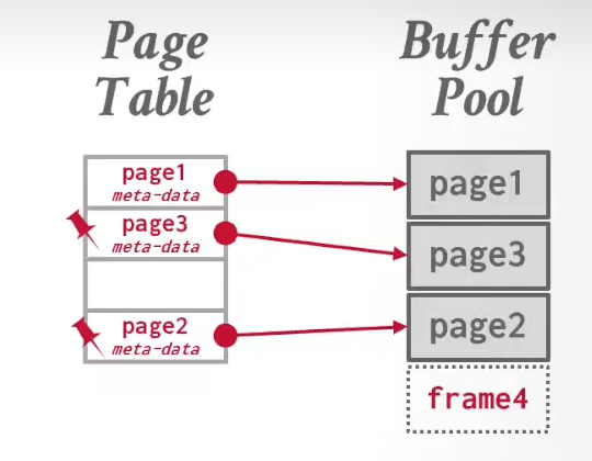 为了在 Buffer Pool 中快速定位某个数据库页面,DBMS 需要维护一套页表(Page Table) 。这里的"页表"是数据库层面的概念,用于将逻辑页面 ID 映射到内存中的缓冲帧位置 ,通常通过哈希表实现。它与操作系统中的页表完全不同,也不应与磁盘上的页目录 (例如文件中记录页面位置的元数据结构)混淆:前者存在于内存中,用于快速查找;后者存在于磁盘上,用于描述数据的物理组织。当数据库需要访问某个页面时,首先查询内存中的页表,判断该页面是否已被缓存,以及它当前位于哪个缓冲帧中。