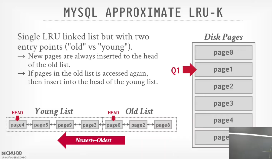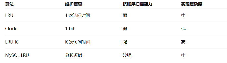 实际上这等价于一个简化版 LRU-2,可以理解为第一次访问进入 Old List(还不算热点),而第二次访问可提升进 Young List(确认是热点页)。因此:顺序扫描页通常只访问一次,其会停留在 Old List 很快被淘汰。而真正的热点页会被多次访问,将其提升到 Young List并长时间保留这在效果上接近 LRU-2,但实现复杂度远低于完整 LRU-K。