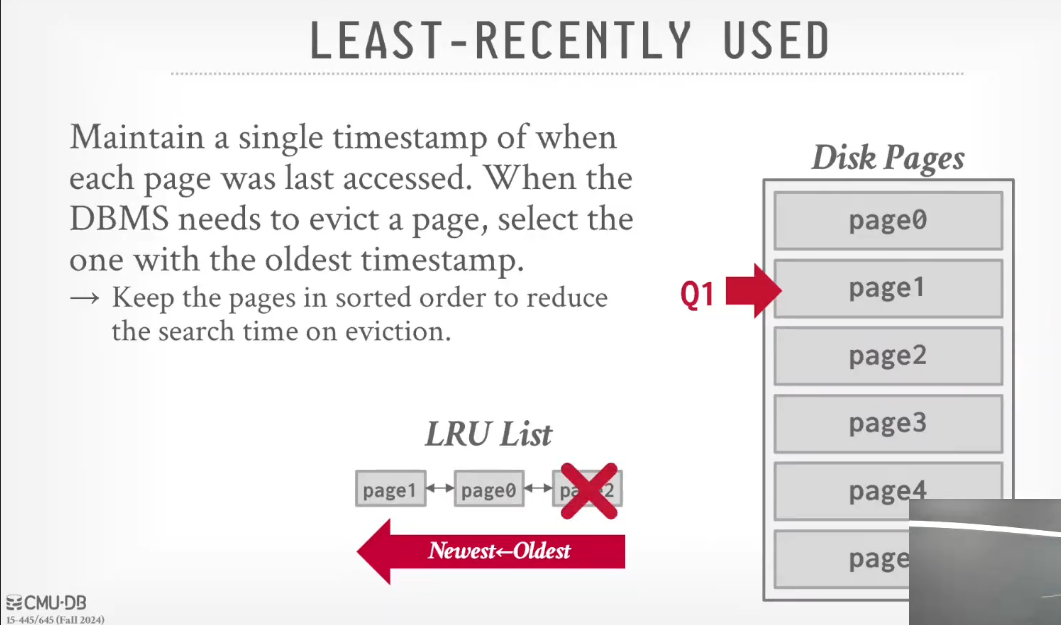 除了存放实际的数据页内容,每个缓冲帧还必须维护一组额外的元数据 ,用于保证系统的正确性与并发安全。其中最重要的包括:脏位(Dirty Bit) :标识该页面自上次写回磁盘后是否被修改 。脏页在被回收之前,必须被安全地刷新到磁盘,否则会造成数据丢失。固定计数(Pin Count) :记录当前有多少线程正在使用该页面。 当某个线程持有指向页面内容的指针时,页面会被"固定"在内存中,其固定计数增加;只有当计数归零时,该页面才有资格被替换或驱逐。这些元数据使得 DBMS 能够精确判断:哪些页面可以安全地被丢弃,哪些页面必须继续驻留内存,以及在何时执行写回操作。