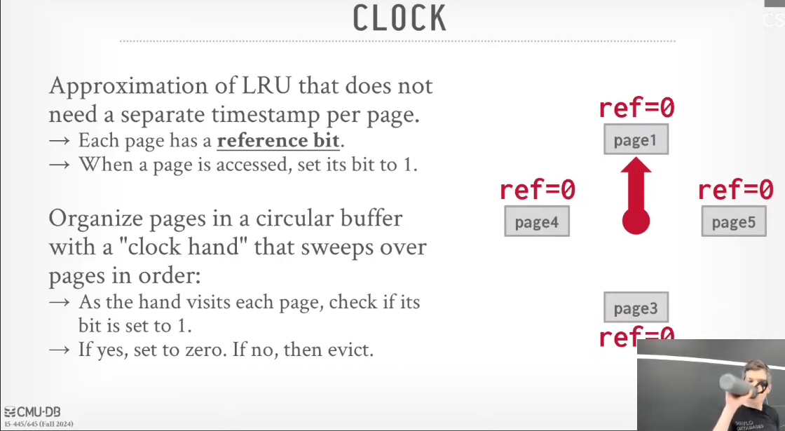 当然,在数据库系统中,Clock 仍然必须遵守两条基本约束:不能驱逐 pin_count > 0 的页面,也不能丢弃尚未安全持久化的脏页。因此实际实现时,在扫描过程中若遇到 pinned 页面,会直接跳过;若遇到脏页,则可能触发后台刷盘或延迟驱逐。