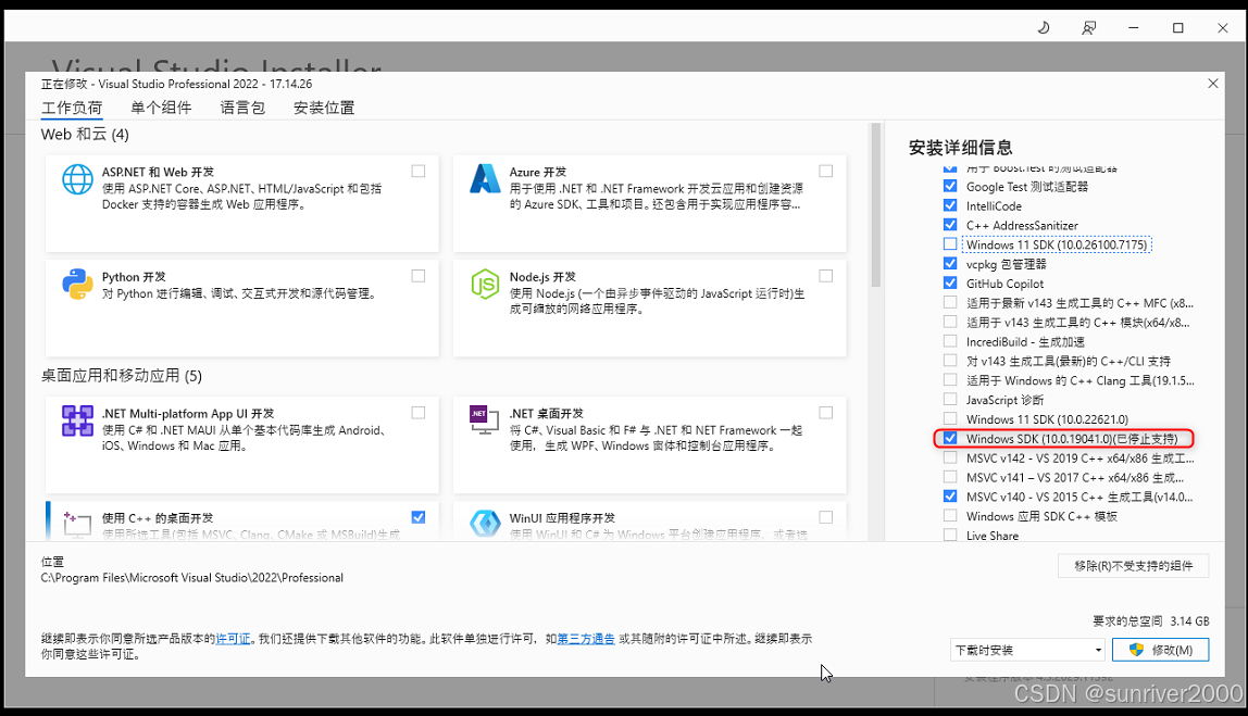 1、打开 Visual Studio Installer,增加安装Windows SDK 10.0.19041.0。
