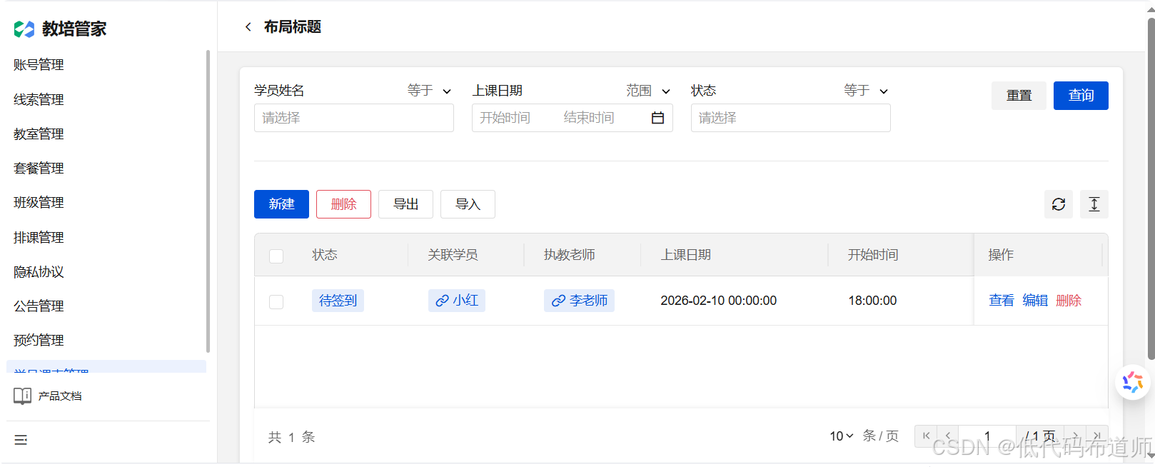 今天,我们将聚焦于后台教务管理,引入系统"心脏"------签到/课消记录表,并实现管理员一键确认预约、同步生成排课记录的核心功能。