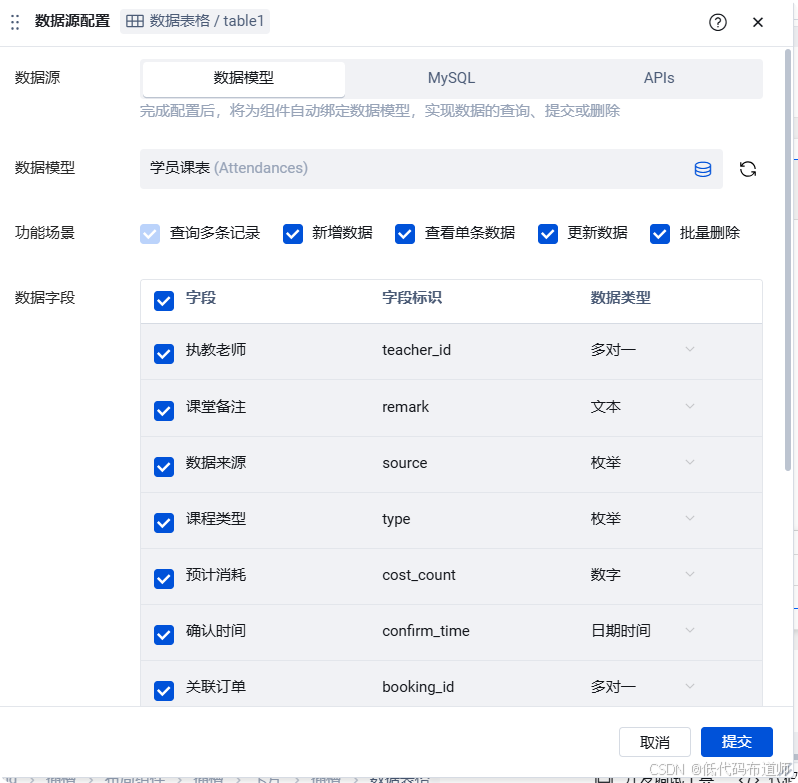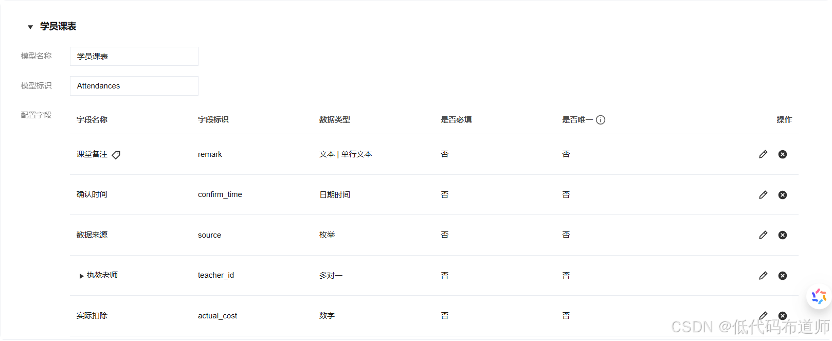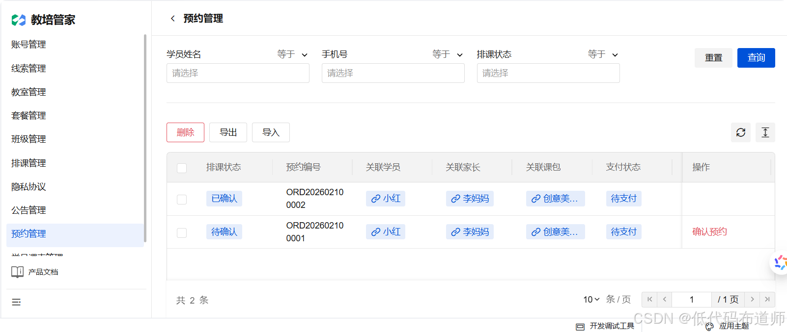 Attendances表作为教务枢纽的设计。 - 后台订单管理搭建:创建预约管理页面,配置数据表格与筛选。