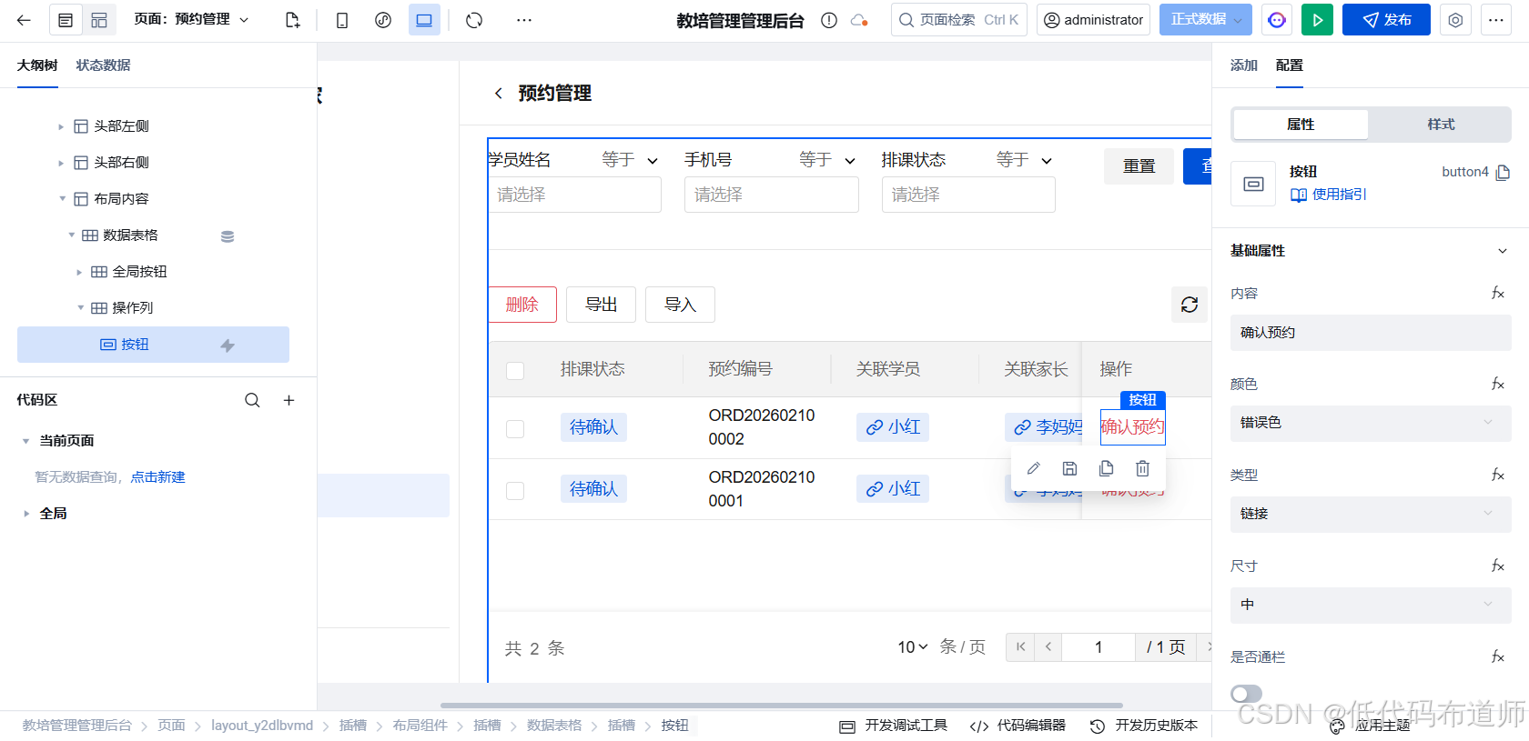 打开预约管理页面,在操作列添加按钮,修改为确认预约