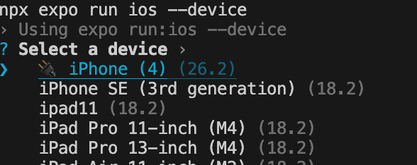 命令执行后会列出当前 USB 连接的 iOS 设备,选择对应设备编号,即可自动编译、安装开发版应用到真机(无需手动打包 IPA)。