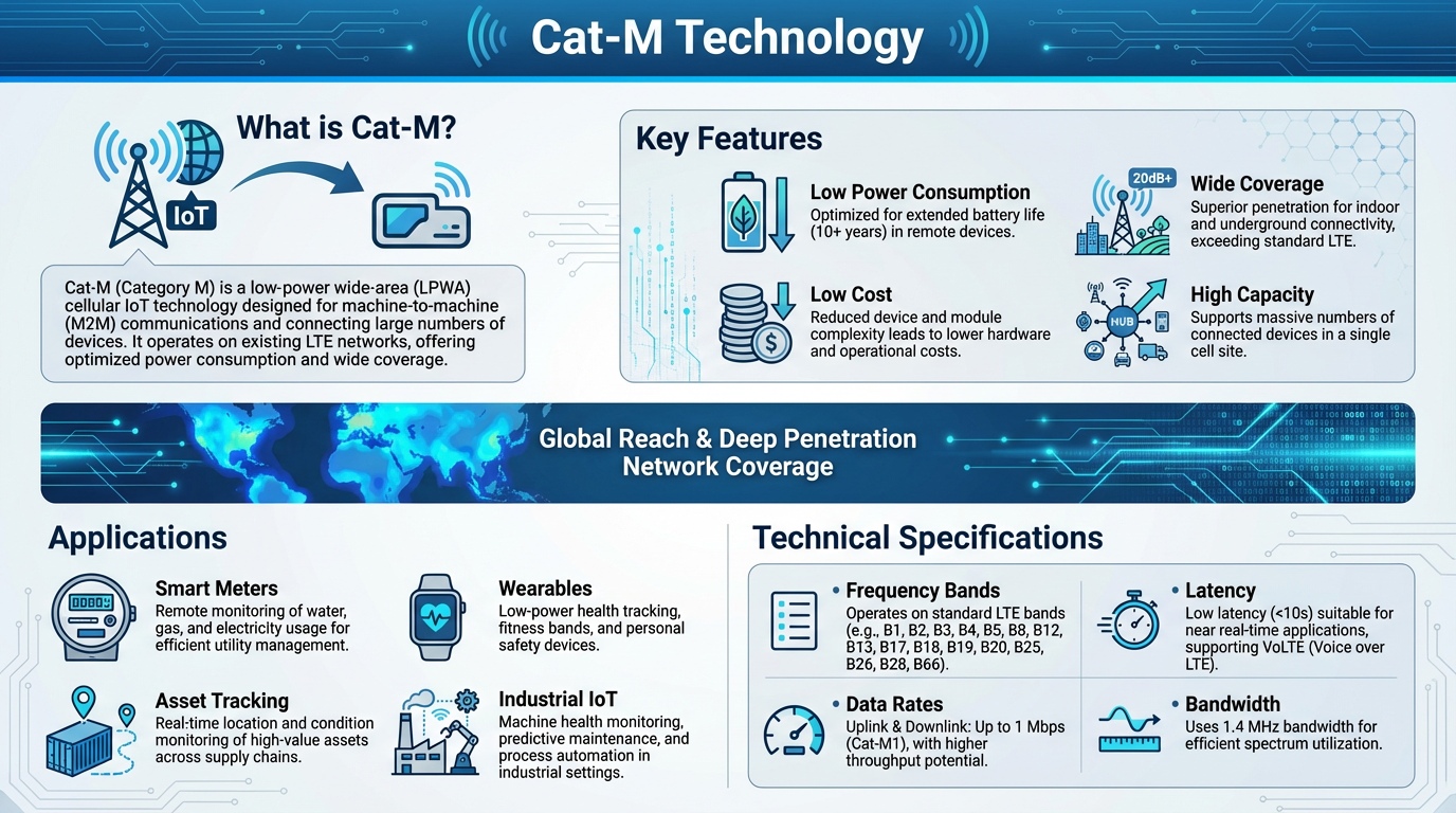 Cat-M(Category M)是LTE技术中的一种优化版本,专为低功耗广域网(LPWAN)应用设计。与传统的蜂窝网络技术相比,Cat-M具有更低的功耗和更广的覆盖范围,适合需要低数据速率、长期电池续航的应用。Cat-M技术的核心目标是满足物联网设备的低速率、大规模、低功耗连接需求。