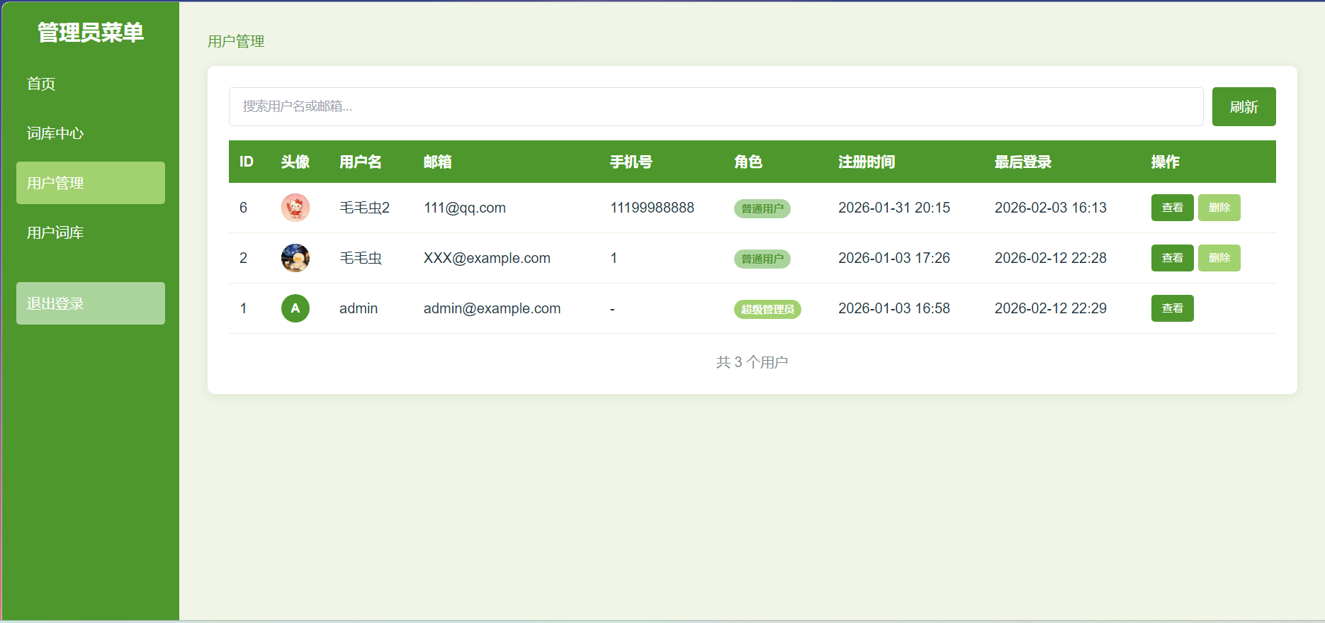 用户通过前端界面进行单词的增删改查操作