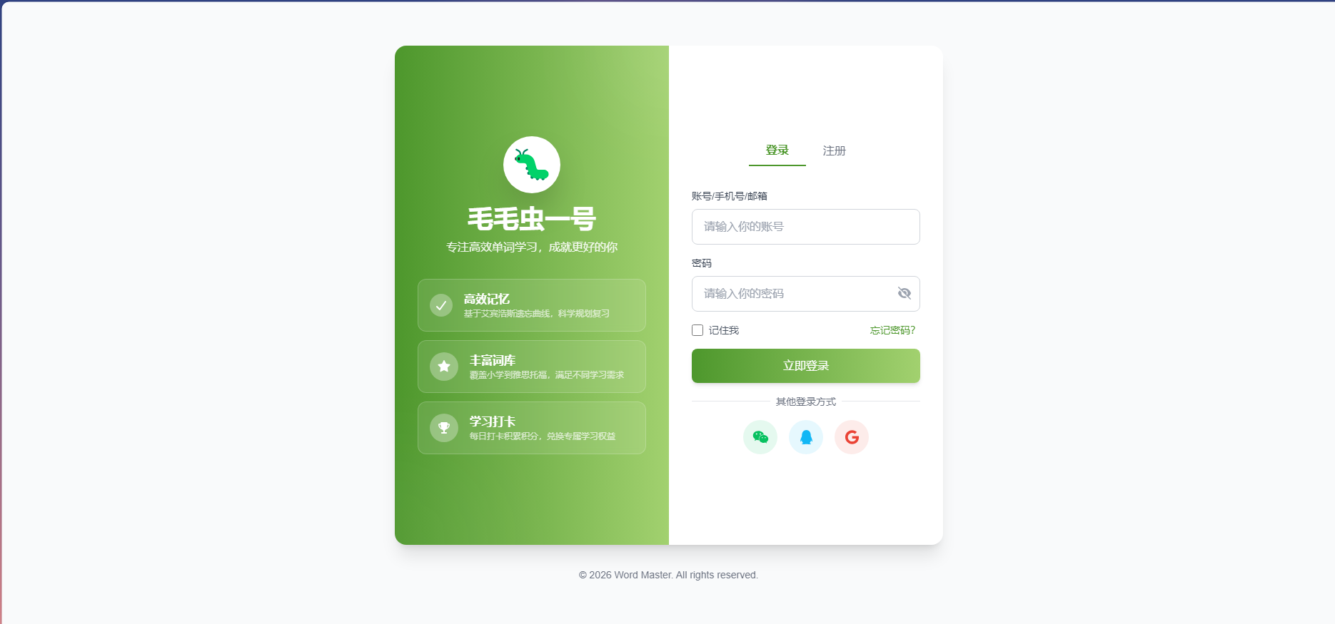 Word Memory Assistant(单词记忆助手)是一个专为用户提供单词记忆功能的 Web 应用系统。该系统采用前后端分离架构,后端使用 Django 框架提供 RESTful API,前端使用 Vue 3 构建用户界面,帮助用户更高效地记忆和管理单词。