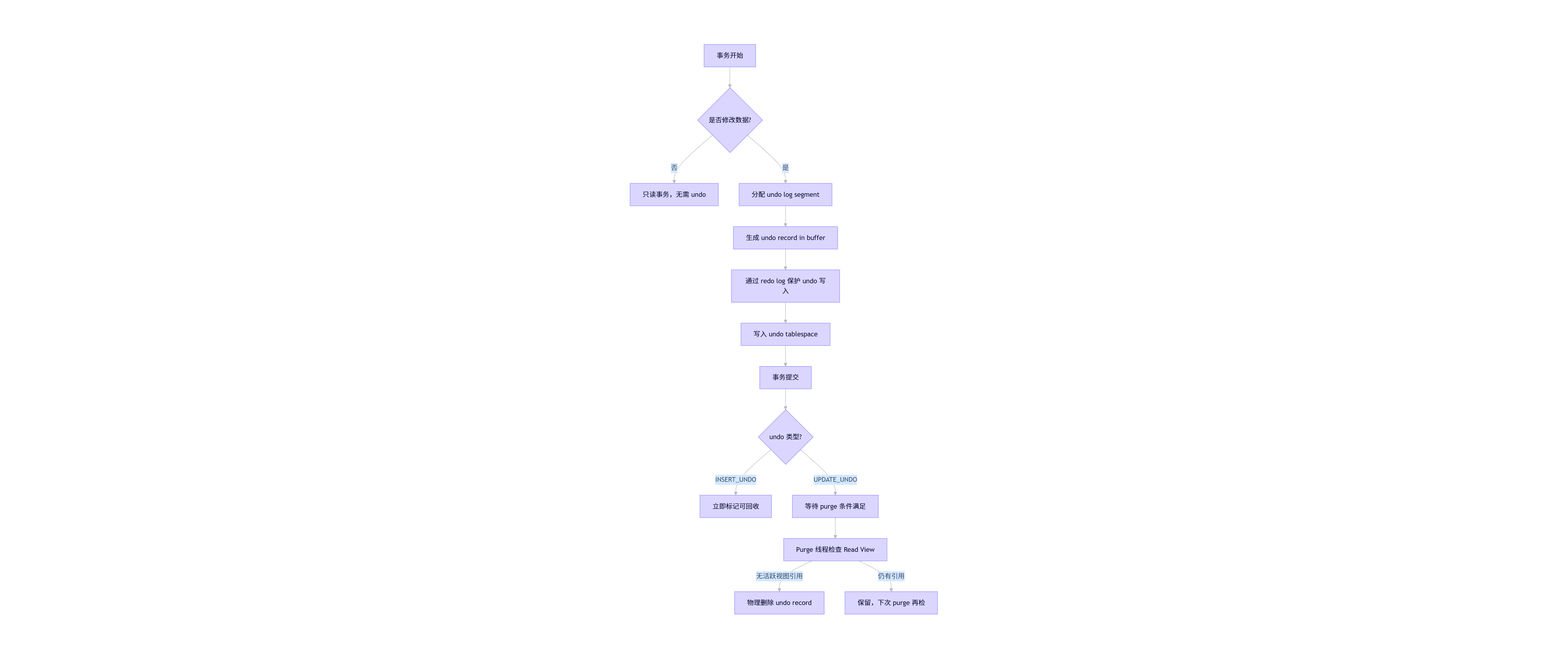 - UPDATE_UNDO:既用于回滚,也用于 MVCC,需等到不再被任何活跃读视图引用后,方可由 purge 线程清理。