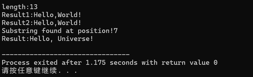 - 字符串替换:replace(a,b,c)中a表示起始位置,b表示被替换的长度。(这里从Hello, World! -> Hello, Universe!)
