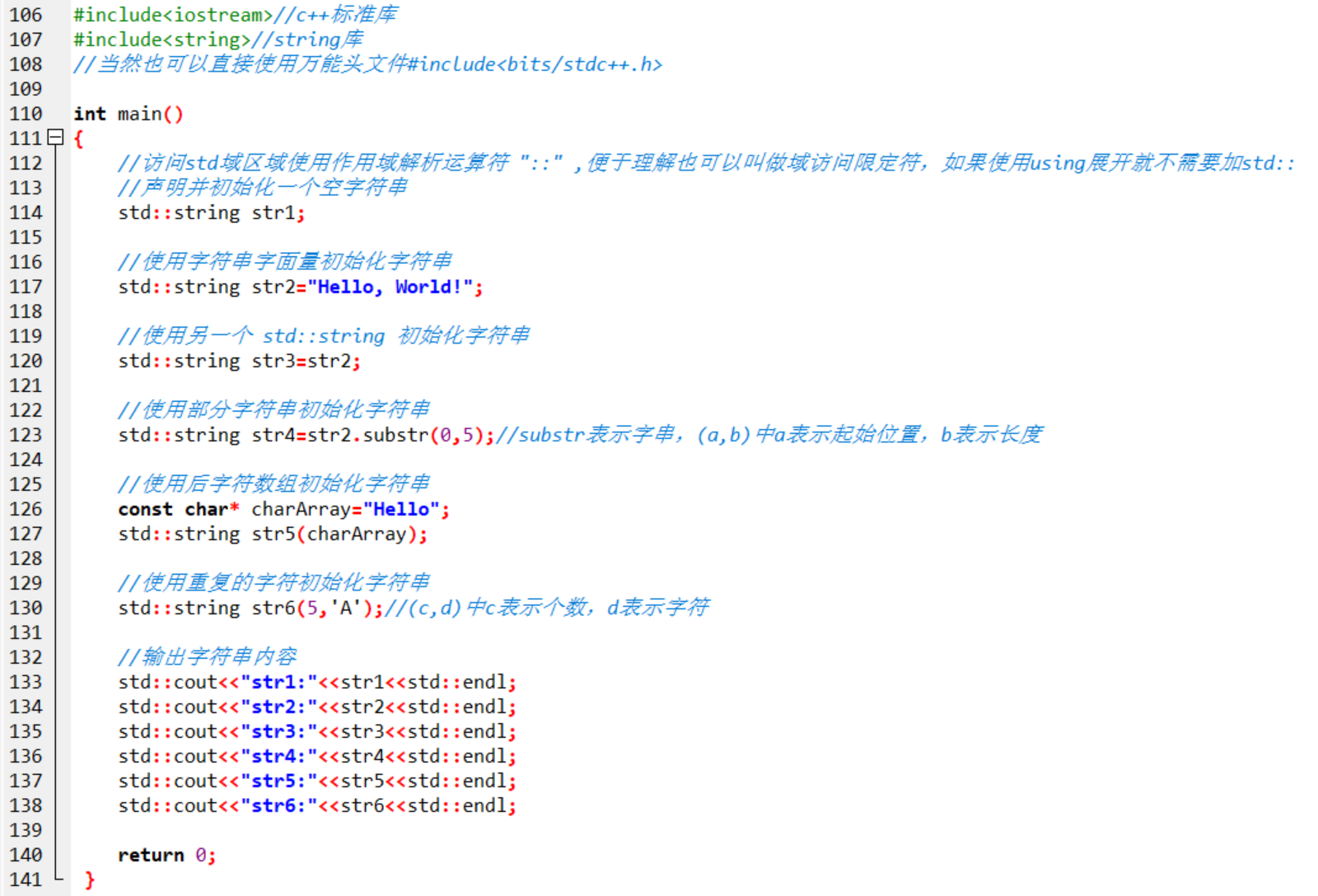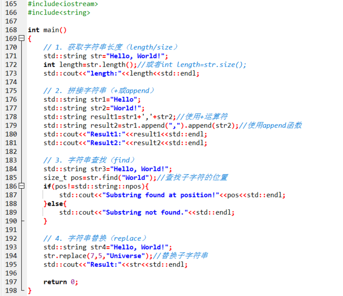 - 查找字符串:find函数找到就返回子字符,未找到返回std::string::npos。