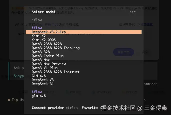 让我们再次启动 OpenCode,并输入 /models 查看是否成功配置了 iflow 的模型: