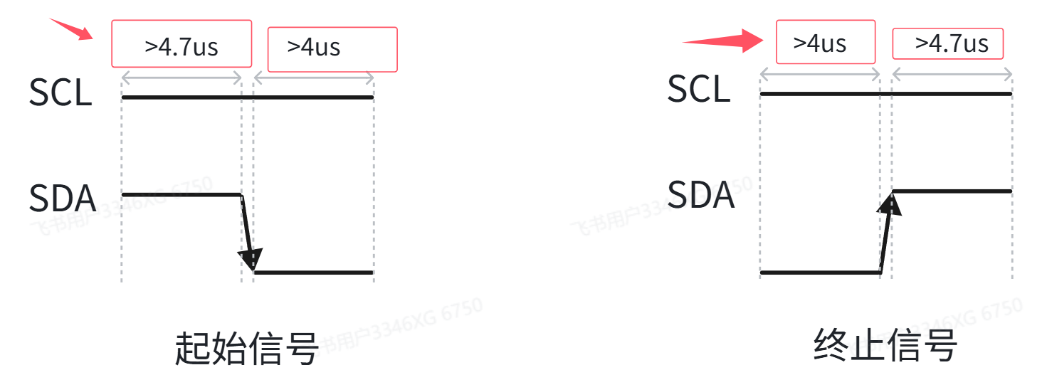起始信号 :SCL线为高电平期间,SDA线由高电平向低电平的变化表示起始信号