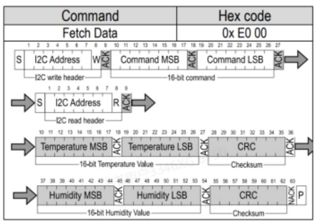 (2) 发送读标志+设备地址,等待SCL拉低,读取温湿度数据。