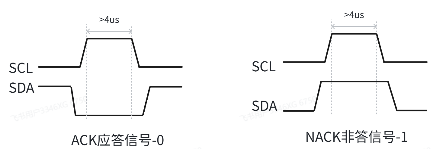 NACK非应答信号 :SCL从低到高再到低时,SDA都为高,表示接收方未成功接收或要求停止传输。