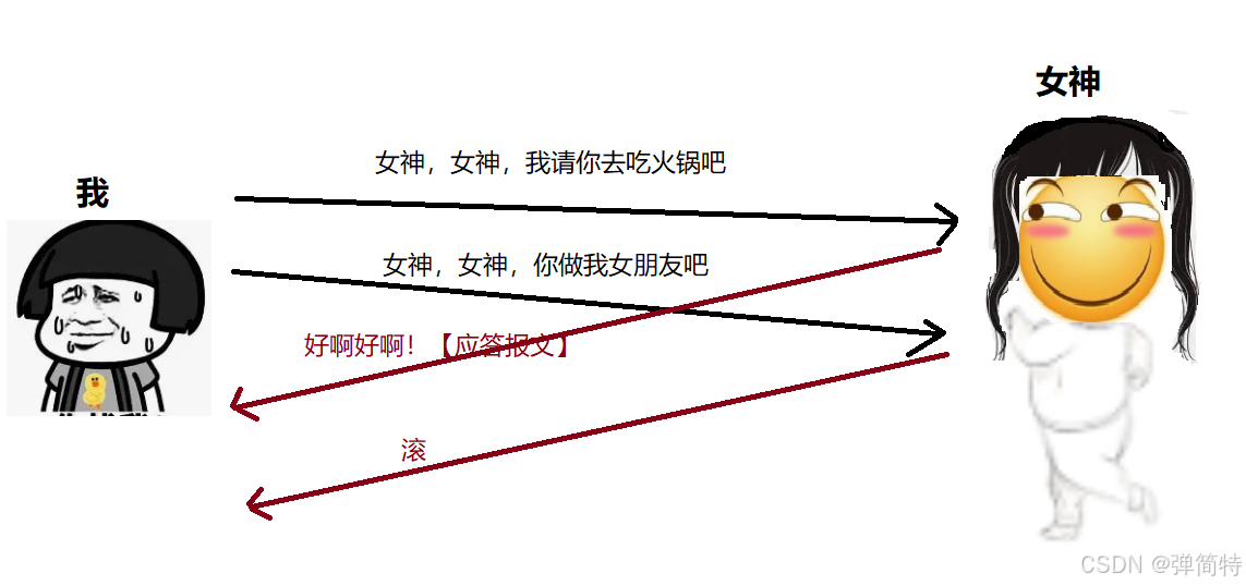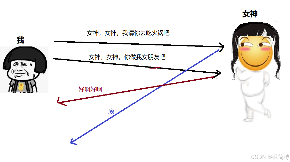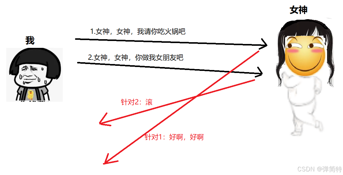 此时呢我收到的肯定是先收到滚,后收到好啊,好啊。于是呢就代表着女神同意做我女朋友,但不同意去吃火锅,这不就让我理解错误了吗?