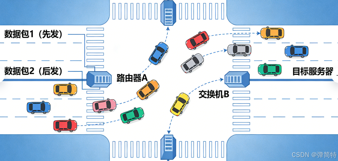 因此呢在我们网络世界中也是类似这样的一个情况,我们在转发数据的时候,我们发的多个数据包就是一辆一辆车,经过的每个路由器或者交换机就等同于十字路口,每个数据包在经过路由器转发的时候,走的路径可能是不同的。因此呢出现了典型的后发先至,如图所示: