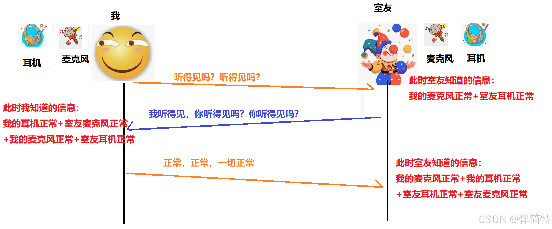 于是第三次通信我 就发送:正常正常,一切正常。此时我的室友收到之后呢,他就知道了,我的室友刚才发送的 "我听得见,你听得见吗?" 已经被我收到了。所以呢此时我的室友也自然就知道了:我室友自己的麦克风是正常的,然后我的耳机也是正常的,从而呢我的室友就知道我设备正常的信息。也就是说我室友知道了我室友的耳机,麦克风都正常,以及我的麦克风,我的耳机正常。