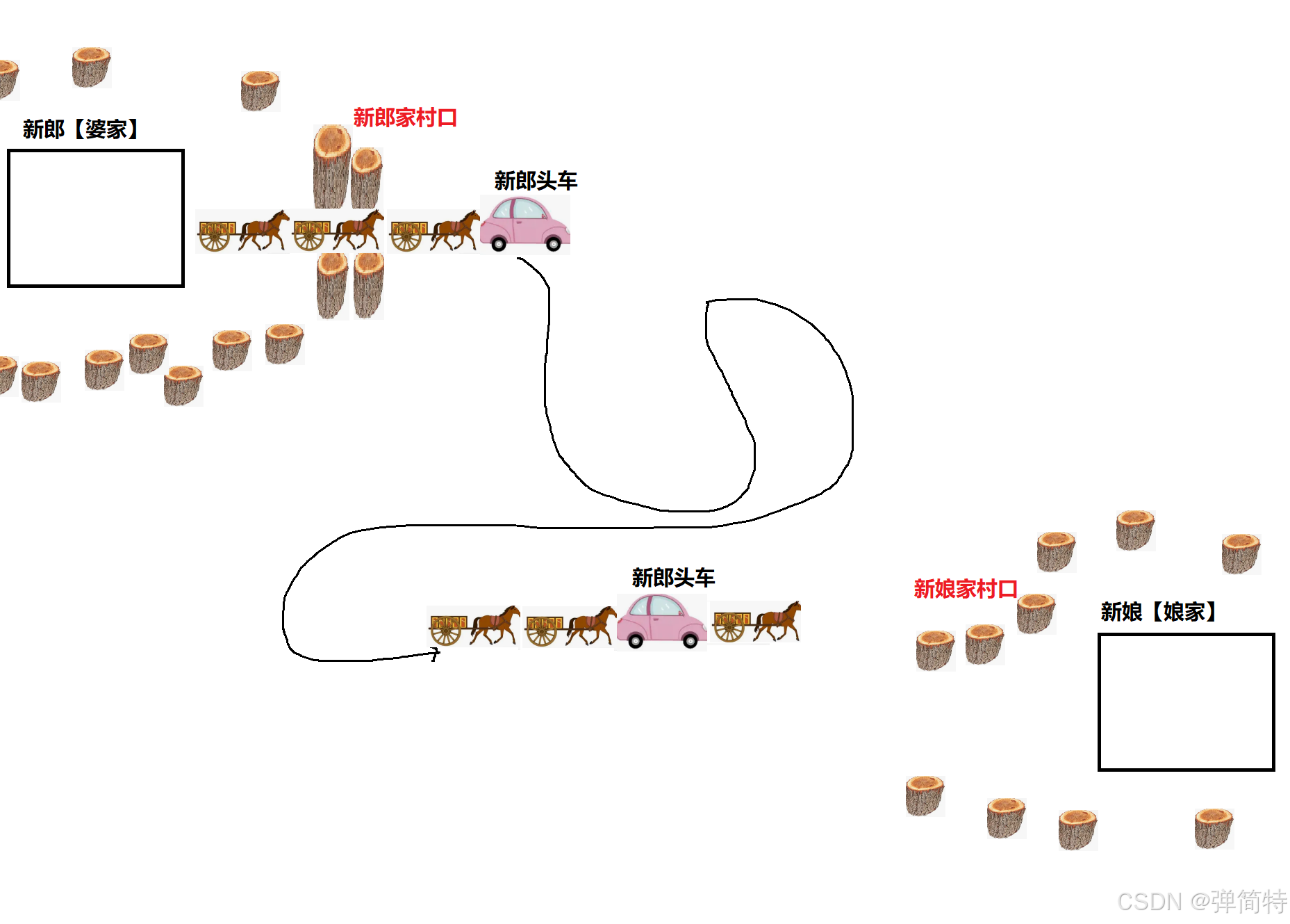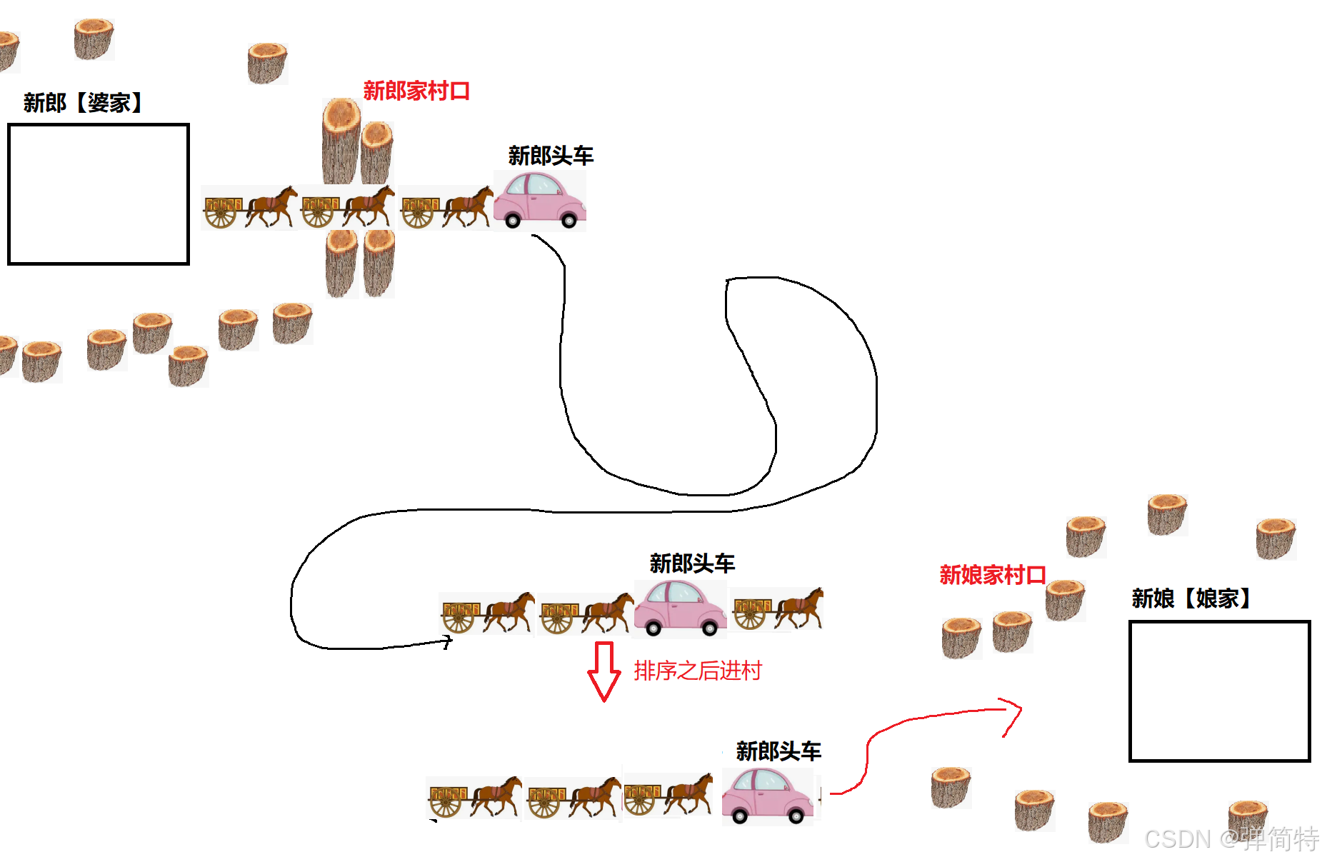 咱们结婚了有一个环节叫做接亲,新郎在婆家,新娘在娘家。我们一大早天没亮,新郎这边呢就会组织一大帮车队啊,带着他的伴郎团队准备去新娘家去接亲,如图所示啊,假设我们的新郎是在头车里面,我们万事俱备,只欠东风,ok,我们这些车队大家一起出发,同时出村,但是呀由于好多好多的原因呢,比如等红绿灯:新郎的头车突然遇到了红绿灯,但是在走的途中呢,后车伴郎他们的车呢是比较快的,他们过了红绿灯,于是啊我们走着走着,哎,这些车队呢会出现走散的一个情况,于是最终我们到达的目的地是相同的,只不过我们到目的地的顺序就不一样了,于是就可能出现后面的候车比头车要先到达新娘家。