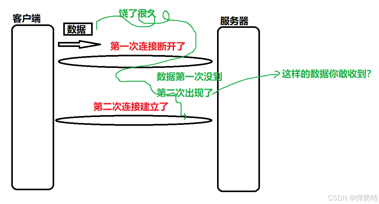 如图:比如有一次我们的客户端给服务器发送数据,但是很遗憾,我们这个数据它迷路了,也就是说它绕了一个很远的弯路,然后还堵车了。导致他一直到不了我们的服务端,在他没有到达服务器之前啊,可能我们的客户端和服务器就已经断开连接了。那后面我们又重新建立连接了,这个迷路的数据,兜兜转转它又跑到服务端了,但是呀你当前的连接已经不是之前的链接了,而你这个数据是之前连接发的数据。那问题来了,你当前连接收到的这个数据是之前连接所发的,这样的数据你要不要? 这样的数据我们是不要的,我们应该丢弃掉,因为我们重新建立连接之后,有一种可能就是我们本次通信所建立的连接程序和之前所建立的连接程序并不是同一个程序。