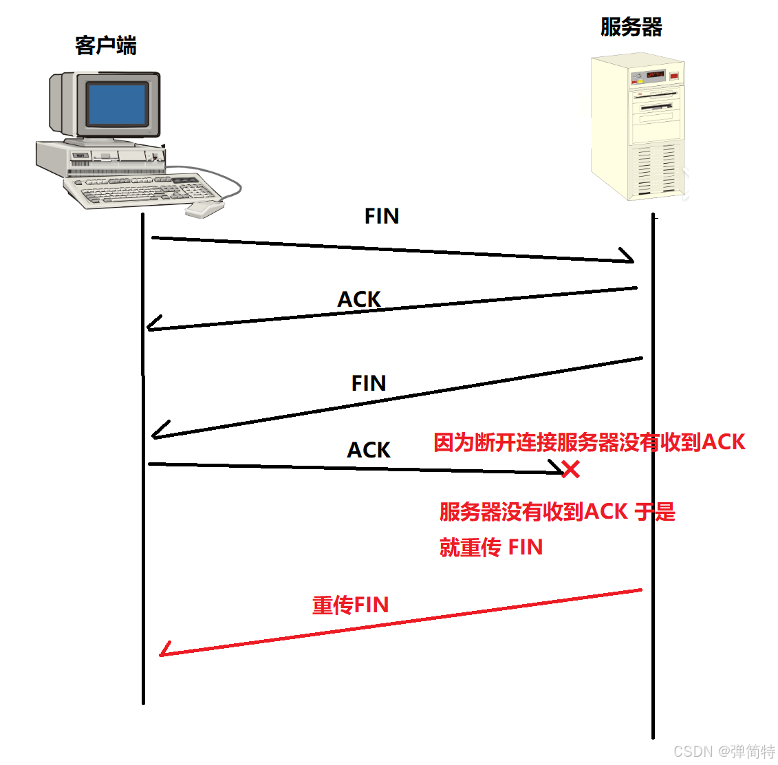 如图所示,我们的关键要点是最后一个ack可能会丢包,如果是前面的数据丢包的话,那么直接触发超时重传机制就可以重传,此时通讯双方的连接都正常的,你可以重传。