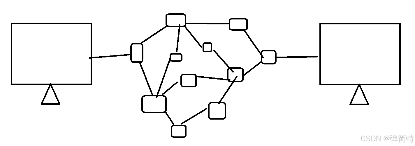 比如堵车这样的一个情况,那么我们为什么会堵车呢?其实啊是因为一段路线中单位时间内能够通过的车的流量是有上限的。一旦超过了这个上限,我们就会堵车。我们的网络世界也是如此,我们主机与主机之间并不是一根网线直接相连的,而是中间有很多很多的设备构建了我们的网络路径:
