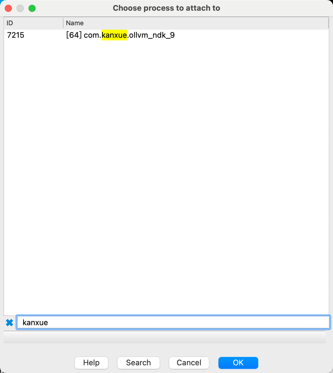 点击debugger>attach to process.. >(手机上打开应用)点击serarch>搜索kanxue并点击这个进程