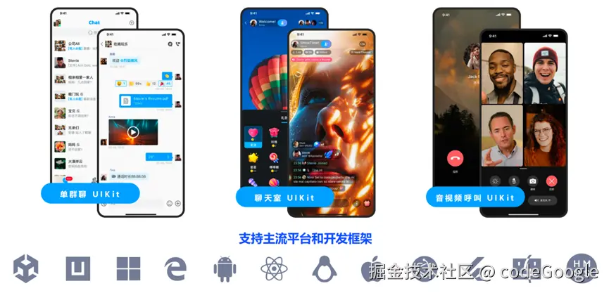 环信提供了 SDK、UIKit、CallKit 等不同层级的接入方式。常见的单聊、群聊、聊天室、音视频等能力基本都能快速接入。UIKit 封装了常用 UI 组件,支持直接复用或二次定制,Demo 也比较完整,能节省不少搭建基础框架的时间。