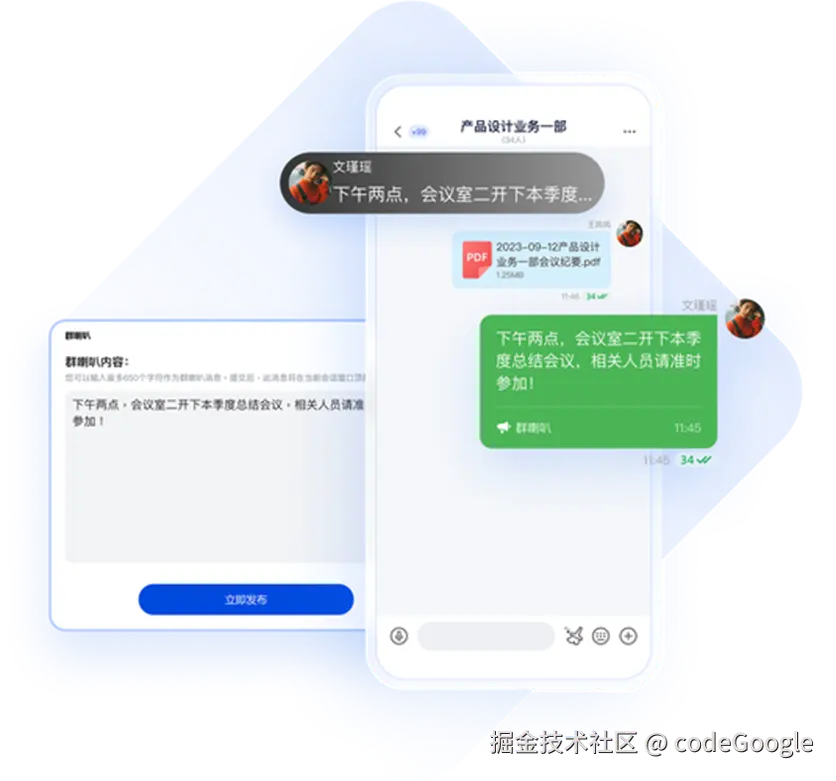 在业务联动方面,通过消息回调和 Webhook,可以把 IM 嵌入 CRM、OA、ERP 等系统,实现工单提醒、状态变更通知、会议提醒等实时交互。同时支持自定义消息类型,用来承载订单卡片、红包、工单等结构化信息。