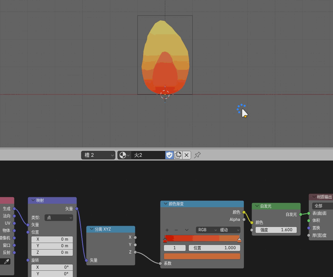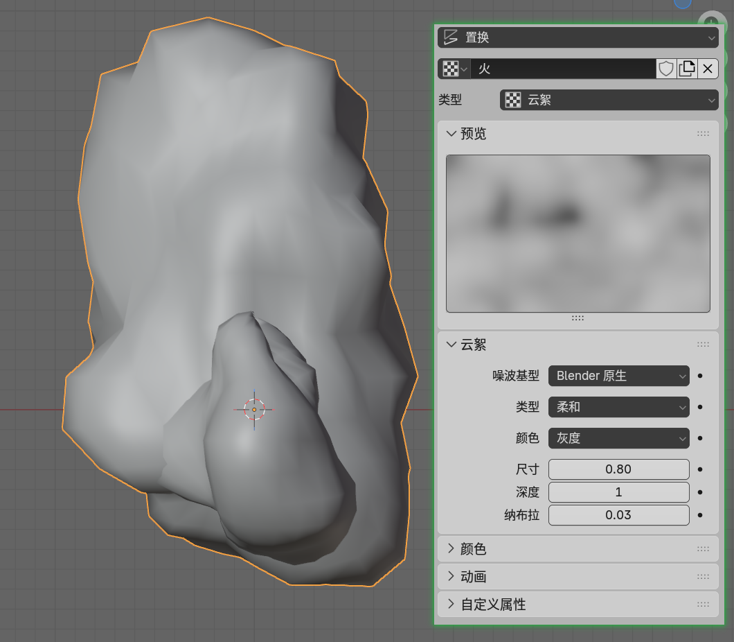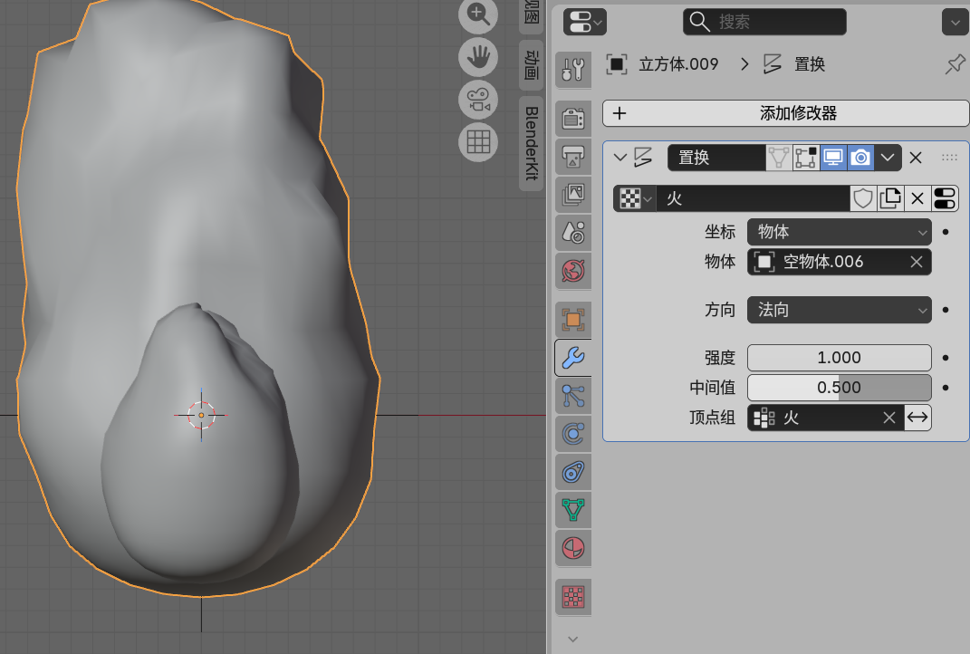 在置换修改器中顶点组设为火,创建一个空物体,置换修改器坐标选择该物体