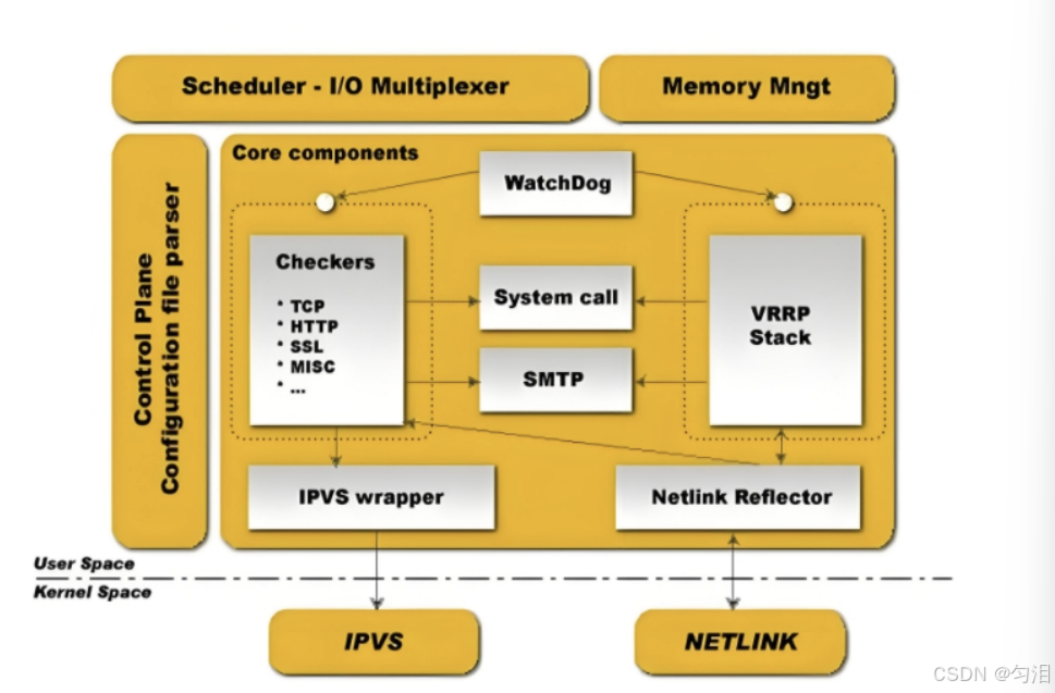 Keepalived 分为用户空间 和内核空间,核心组件集中在用户空间,与内核空间的 IPVS、NETLINK 交互。