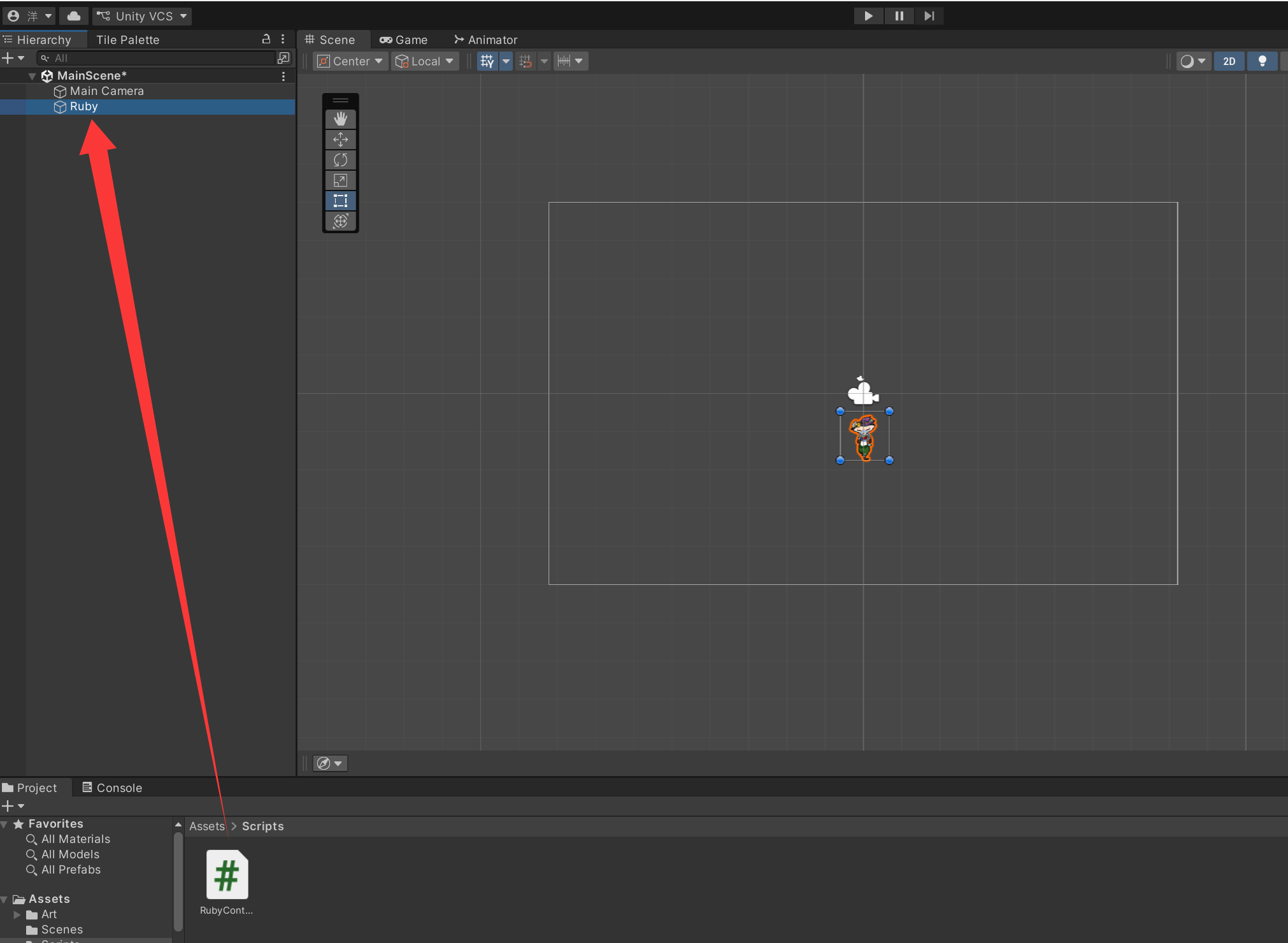 RubyController脚本拖到 Hierarchy 中的 Ruby 游戏对象上,将脚本组件添加到对象上。
