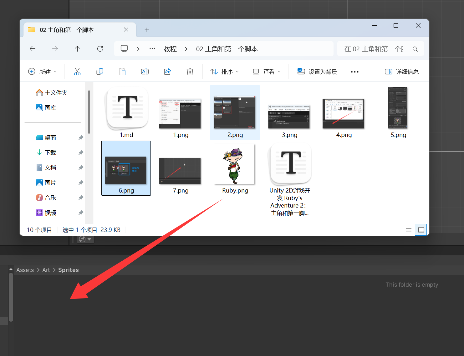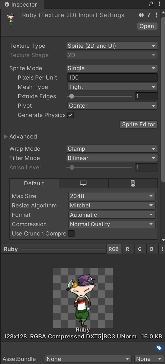 精灵 是在游戏中绘制的图像。Unity 无法使用你直接为 Ruby 导入的 .png 图像文件,而是需要将此文件转换为可使用的格式。
