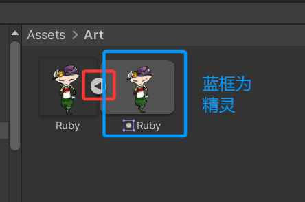 1. 单击 Project 文件夹中 Ruby 图像旁的小箭头。你会发现,该图"包含"似乎相同的图像,实际上就是 Unity 为你创建的精灵。
