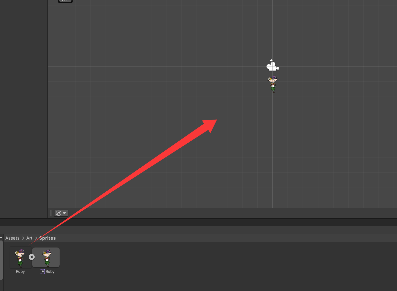 2. 将此精灵 从 Project 窗口拖入 Scene 视图,即可将此精灵作为新游戏对象 添加到你的场景 中。请使用 2D 视图。