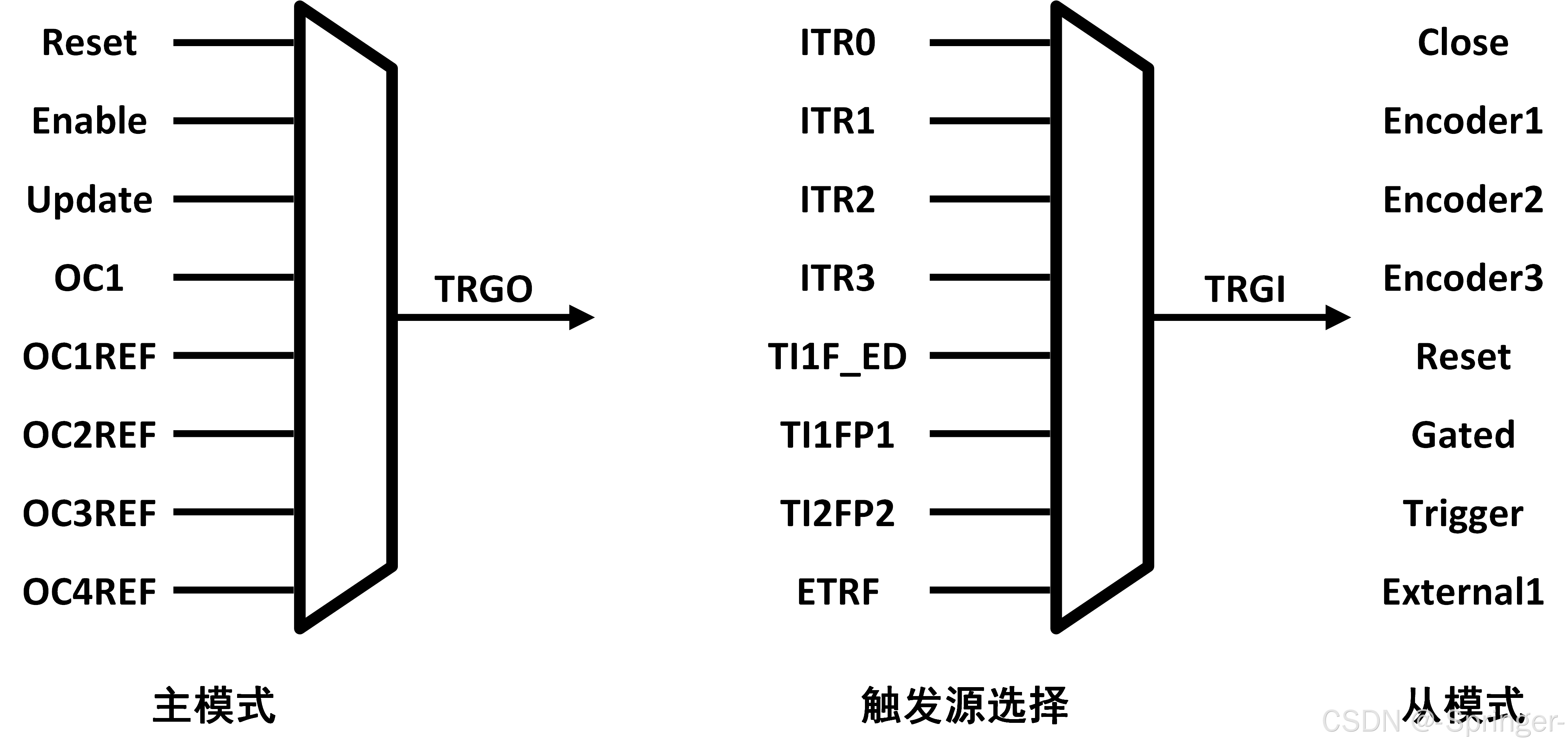 (2)触发源选择(Trigger Source Selection) :触发源选择模块负责从多个候选信号中选取 TRGI(Trigger Input),作为从模式控制器的输入。候选信号包括:内部触发信号(ITR0~ITR3,用于定时器级联)、通道输入信号(TI1F_ED, TI1FP1, TI2FP2)和外部触发信号(ETRF)。