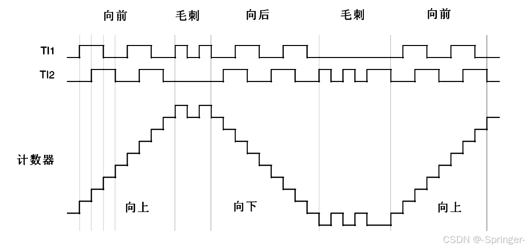 在编码器接口配置为 TI1 和 TI2 双路计数且均不反向的模式下,计数器的操作行为由两路正交信号(TI1、TI2)的相位关系与边沿触发共同决定。当编码器正向旋转时,TI1 与 TI2 保持 90° 相位差,TI1FP1 与 TI2FP2 的有效边沿按固定顺序出现,硬件依据另一路信号的电平状态自动执行向上计数;当编码器反向旋转时,相位关系反转,有效边沿顺序改变,硬件切换为向下计数。对于信号毛刺等干扰,由于其不满足正常相位差条件,计数器会产生短暂的反向抖动,但整体趋势仍能准确反映实际旋转方向与位置变化。这一硬件级的信号解析机制,确保了在复杂工况下对编码器位置、方向及转速的可靠测量。