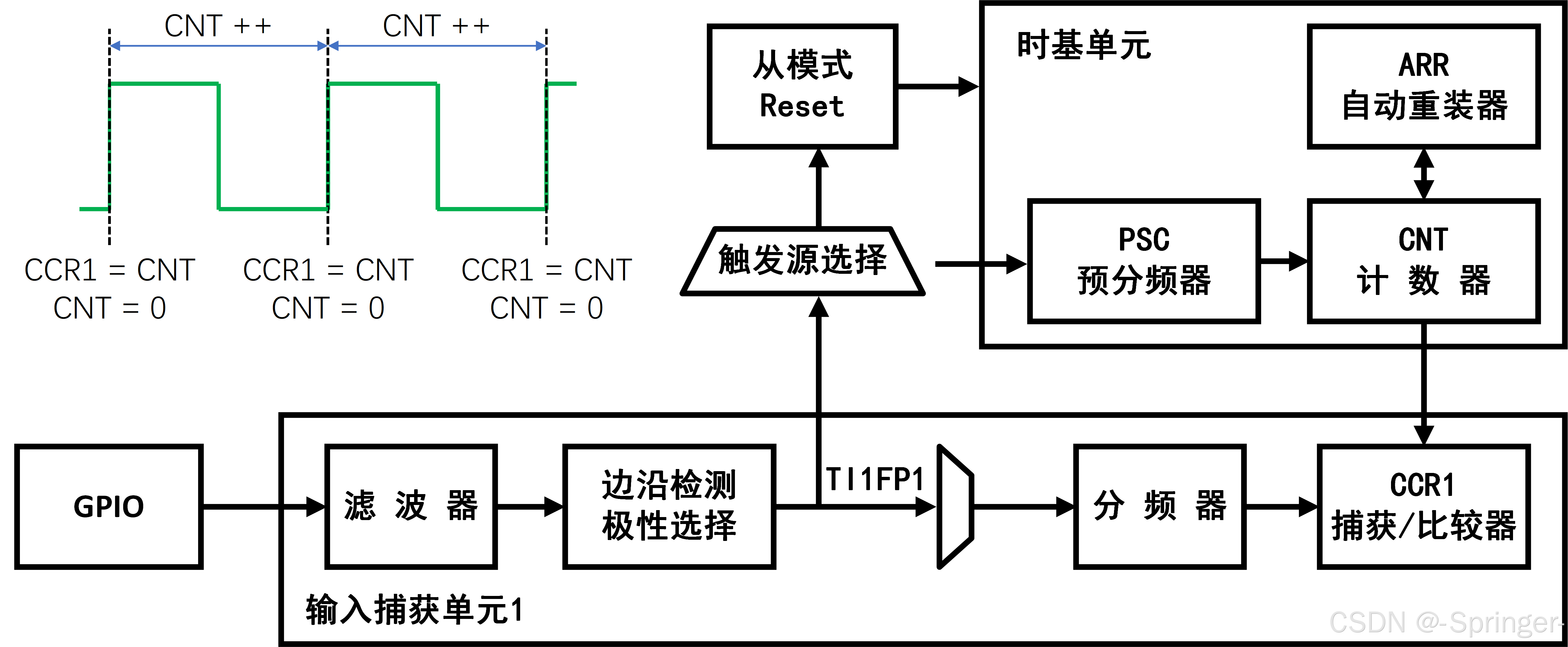 输入捕获通道是 STM32 定时器的核心功能模块,用于对外部或内部信号的边沿事件进行时间戳记录、频率测量及脉冲宽度检测。以通道 1 输入部分为例,其信号处理流程可分为以下关键阶段: