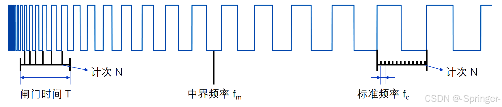 测周法 与测频法的测量逻辑相反,主要用于低频信号的精确测量,其核心是利用标准频率信号进行计时计数。选取被测信号的两个连续上升沿作为计时起点与终点,此时间间隔即为被测信号的周期 T x T_x Tx;在该时间间隔内,以已知精确值的标准频率 f c f_c fc 为基准进行计数,得到计数结果 N 。由于标准频率 f c f_c fc 的周期 T c = 1 / f c T_c=1/f_c Tc=1/fc,被测信号的周期 T x = N ⋅ T c T_x=N \cdot T_c Tx=N⋅Tc,进而可推导出被测信号的频率计算公式 为 f x = f c / N f_x=f_c / N fx=fc/N该方法的测量精度与标准频率的精度正相关,被测信号频率越低,周期越长,计数结果 N 越大,相对误差越小。