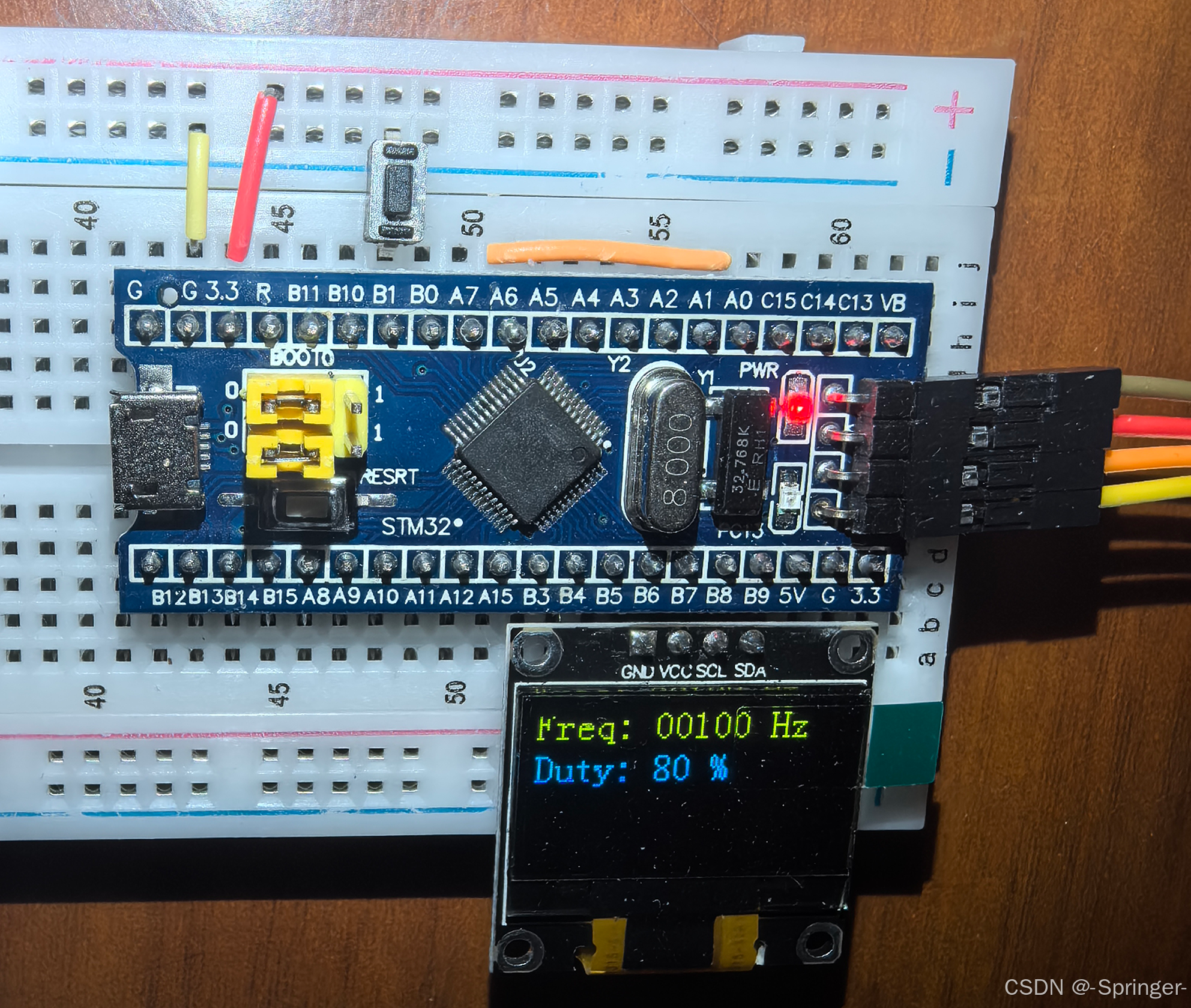IC_Init();OLED_ShowString(1, 1, "Freq: 00000 Hz"); OLED_ShowString(2, 1, "Duty: 00 %"); // Current: ARR + 1 = 100 // Freq = 72M / (PSC + 1) / (ARR + 1) PWM_SetPrescaler(7200 - 1); // Duty = CCR / (ARR + 1) PWM_SetCompare1(80); while(1){ OLED_ShowNum(1, 7, IC_GetFreq(), 5); OLED_ShowNum(2, 7, IC_GetDuty(), 2); }}