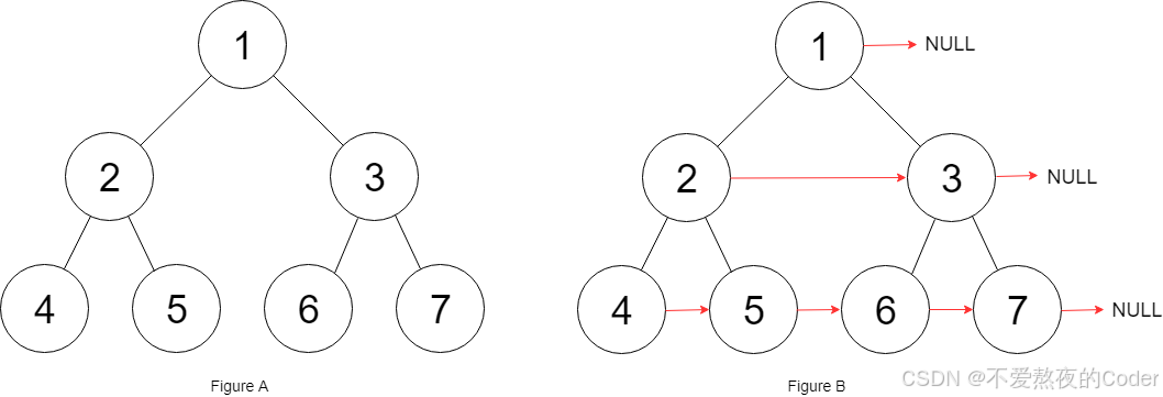 解释 :给定二叉树如图 A 所示,你的函数应该填充它的每个 next 指针,以指向其下一个右侧节点,如图 B 所示。序列化的输出按层序遍历排列,同一层节点由 next 指针连接,'#' 标志着每一层的结束。