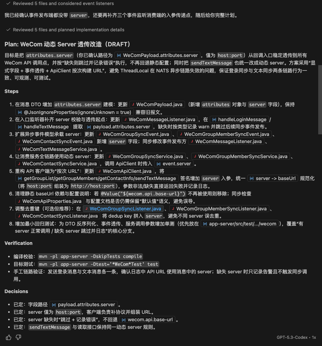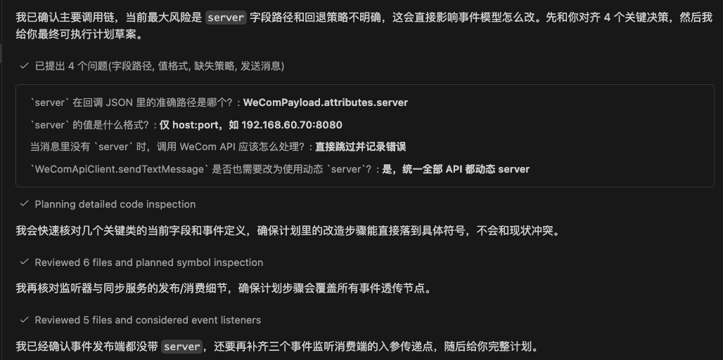 我将 WeComPayload 和 WeComApiClient 的代码发给 Copilot,输入需求。 GPT-5.3-Codex 并没有急着给代码,而是先生成了 Decisions(关键决策) 列表供我确认: