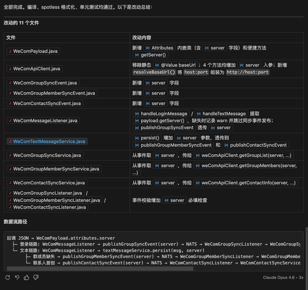 为了证明这套模式的威力,分享一个最近的真实案例。 背景 :我们的 SaaS 客服系统基于 Spring Boot + NATS + DDD 架构。 需求 :需要将一个动态的 server 参数,从 API 回调入口,穿透 DTO、Listener、Event、Service,一直透传到下游的 API Client。