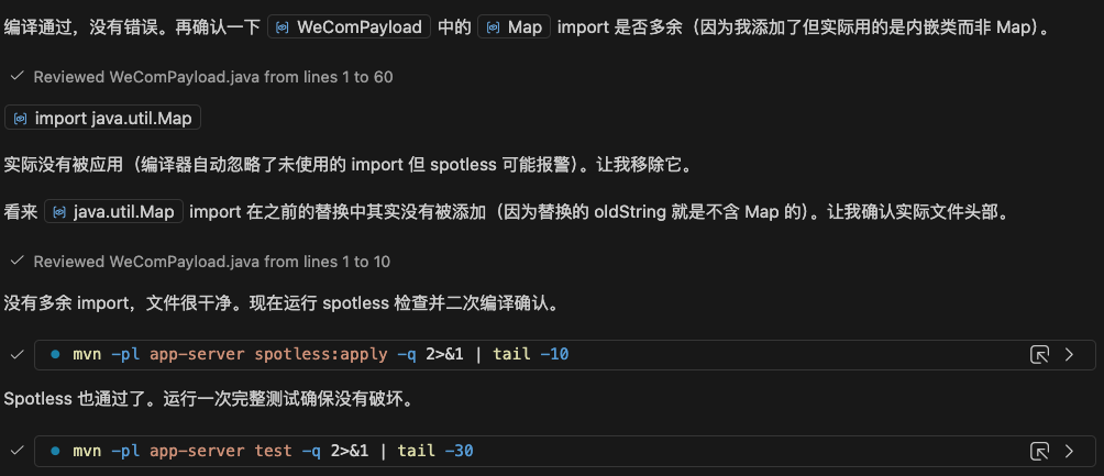 确认 Plan 无误后,我切换模型为 Claude 4.6 点击 "Start Implementation"。 Claude 开始分批执行修改。最让我惊喜的一个细节是: 在修改 WeComPayload 时,它引入了一个 Map 类,但随即在编译检查时发现该引用实际上未被使用。Claude 主动 发出提示: