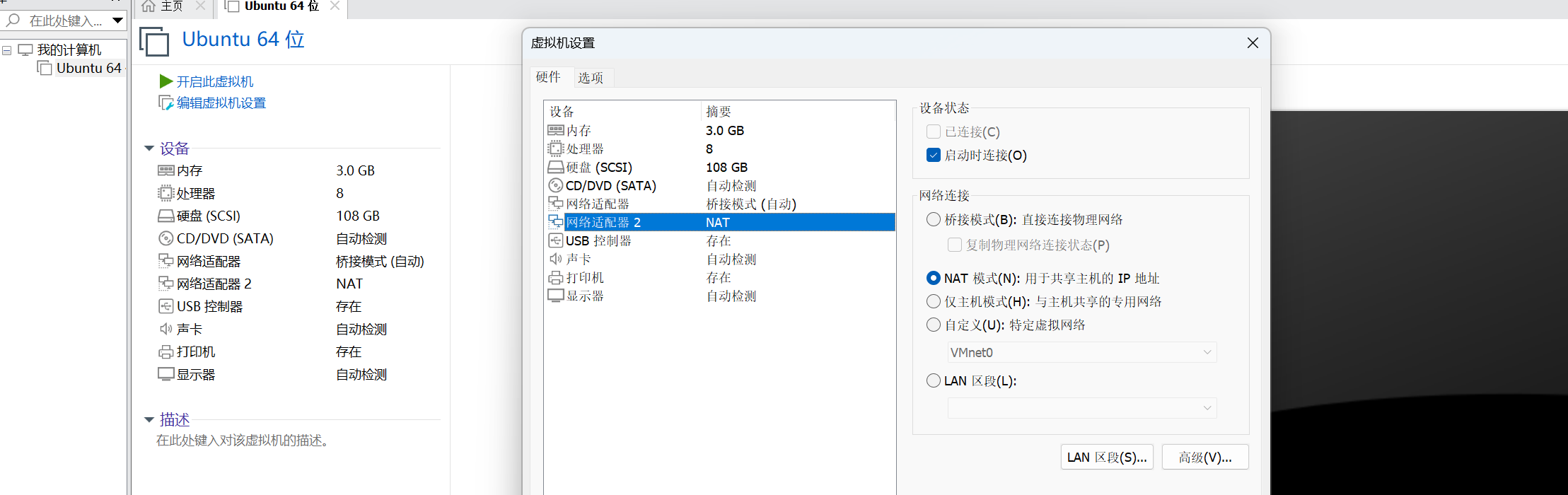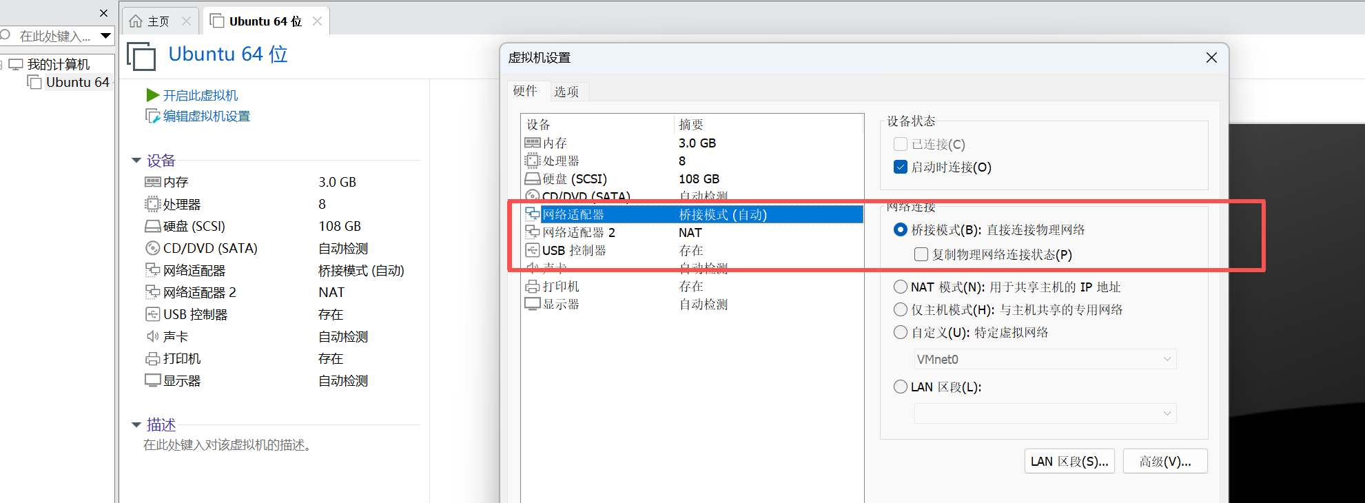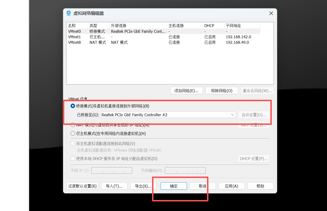 注意:VMnet0设置的网段不能和VMnet1、 VMnet8 的网段一样,不然会有冲突。需手动设Ubuntu 中桥接网络的 IP。