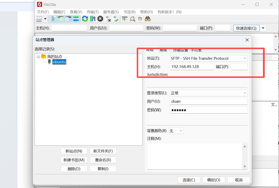使用 Filezilla 软件验证 Ubuntu 和 Windows 文件互传,依次打开 文件 -> 站点管理器。