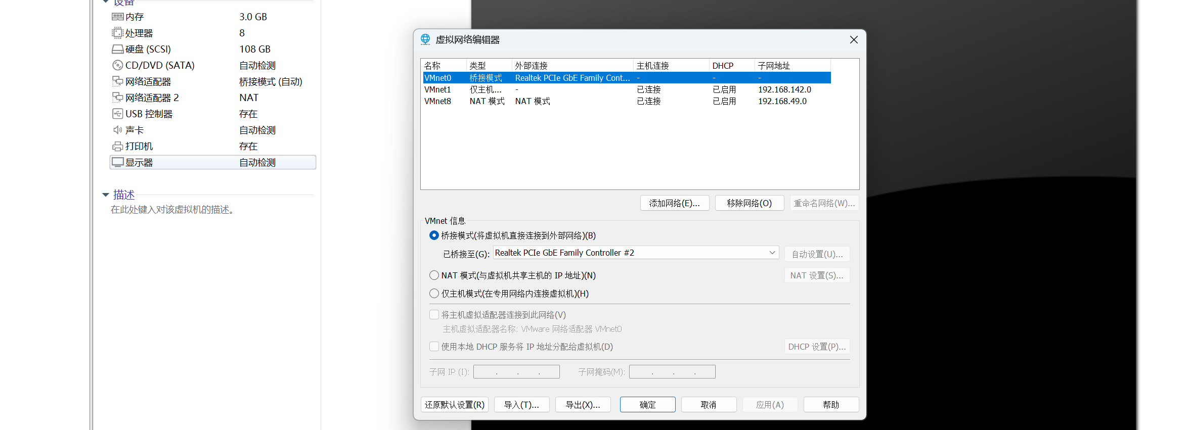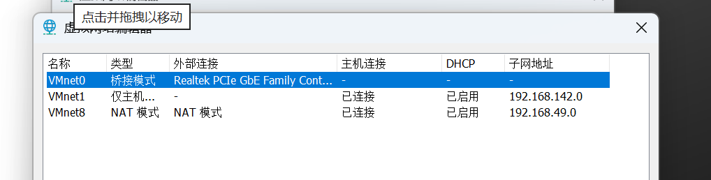 | 以太网适配器 VMware Network Adapter VMnet0 | 不提供 DHCP | 用于桥接网络,要在虚拟网络编辑器设置手动设置 IP |